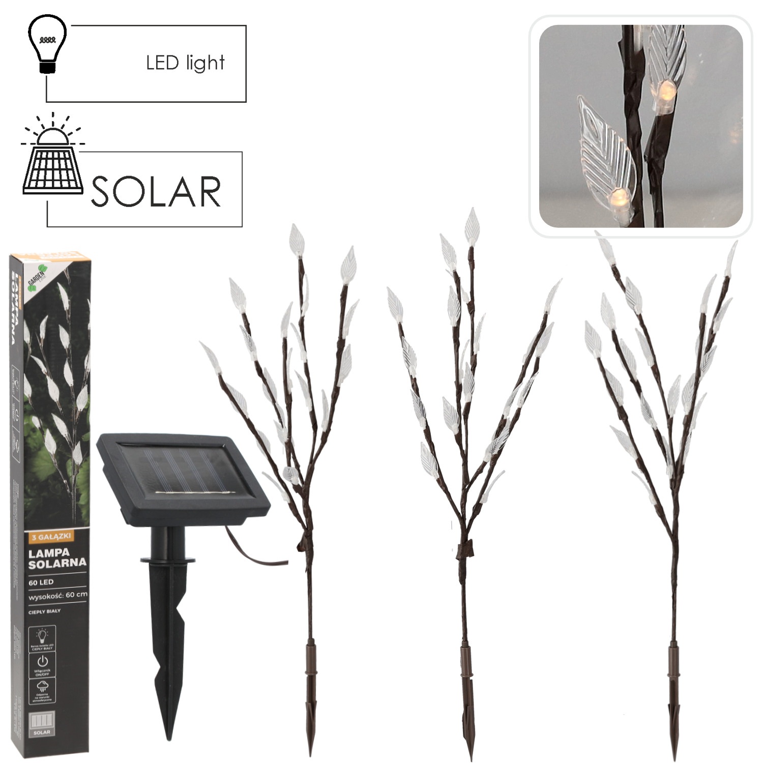 Solární lampa 3 větve, 60 LED, teplá bílá, 60 cm