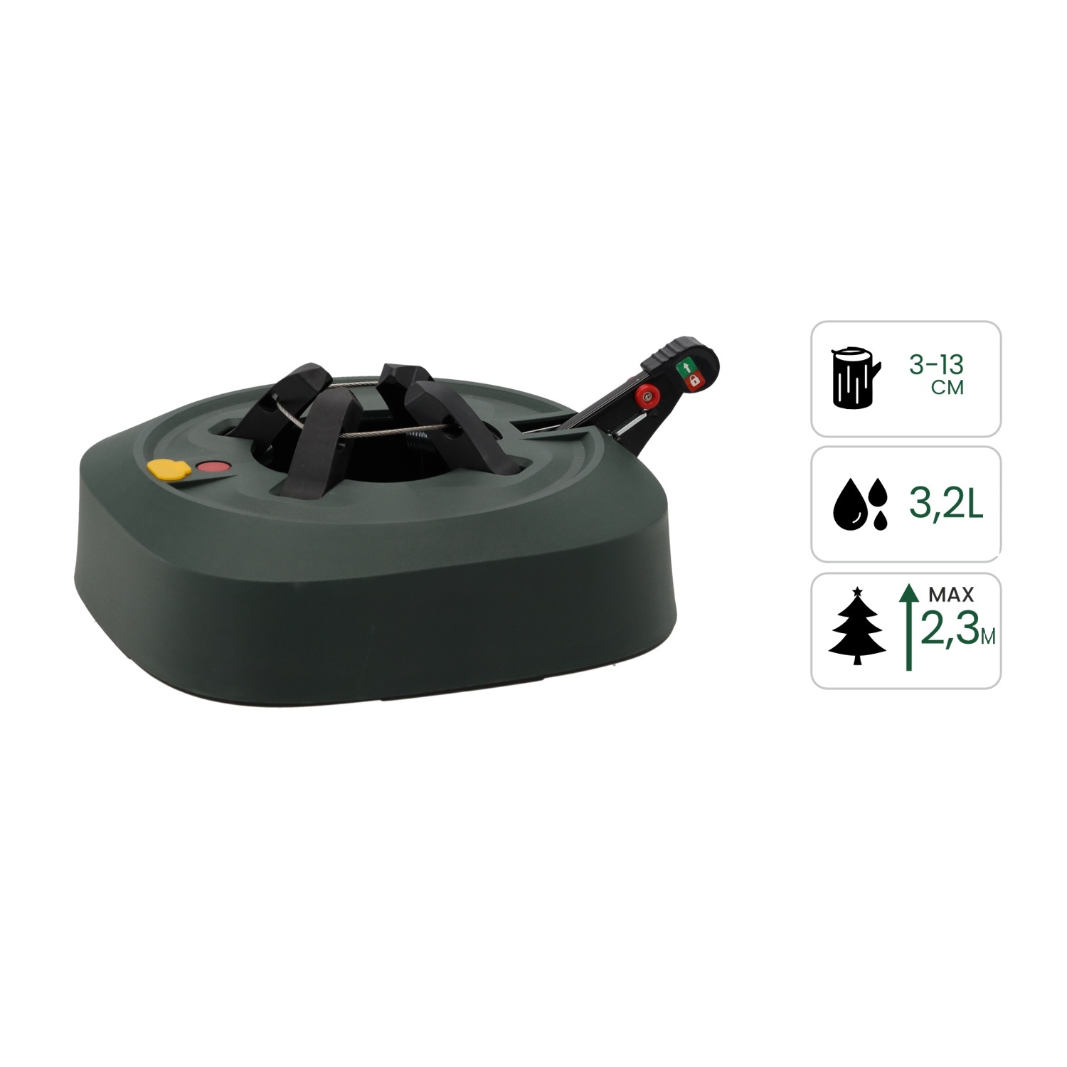 Stojan s pedálem. Toto praktické řešení slouží ke stabilnímu postavení vánočního stromku o výšce až 2,3 m. Díky inovativnímu systému může být montáž provedena bez ručního šroubování. Prostorná nádrž na vodu (3,2 l) udržuje čerstvost stromku po delší dobu a pevná konstrukce z plastu a kovu zajišťuje dlouhodobou stabilitu.