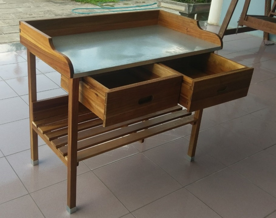 Dřevěný stůl vyrobený z kvalitního akátového dřeva. Stůl je vhodný na grilování nebo třeba přesazování květin. Obsahuje dvě zásuvky, odkládací desku a na bocích háčky na pověšení.