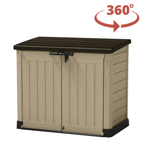Uzamykatelný přístřešek Keter Store-It-Out Max nabízí kapacitu 1200 l, takže poslouží jako perfektní prostor pro uložení popelnic, bazénové technologie a vybavení či zahradního nářadí. Horní kryt je vybavený automatickým mechanismem otevírání pomocí hydraulických válců a kovové vzpěry udrží víko otevřené pro snadné plnění popelnic. Díky zešikmenému prahu je přístřešek připravený i na nakládání kontejnerů s kolečky, s jejichž uskladněním tak nebudete mít nejmenší problém. Může však sloužit také jako úložný prostor pro dílenské nářadí, kdy je možné vodorovně doinstalovat poličky s nosností až 20 kg pomocí zahrnutých konzol a úchytů. Široké 2křídlé dveře jsou ze shora uzamykatelné pomocí šroubu a zespodu prostřednictvím zámku. Uživatelé, kteří bydlí v rušných čtvrtích, si tak mohou obsah přístřešku pojistit přídavným visacím zámkem, čímž se sníží riziko krádeže popelnice či jiného příslušenství. Přístřešek je vyrobený z vysoce kvalitní polypropylenové pryskyřice v moderním designu, který imituje strukturu přírodního dřeva. Stěny jsou vyztužené žebrovými segmenty, které hravě odolají i drsnému zacházení, vandalismu, extrémnímu počasí i UV záření.